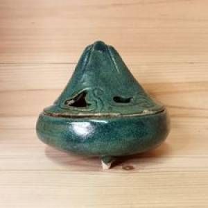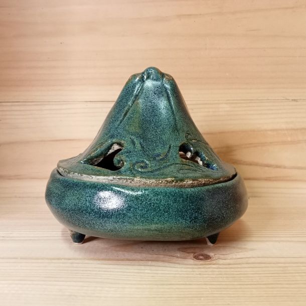 Realizzato in argilla refrattaria smaltata. È formato da due pezzi, il tetto può essere sollevato per inserire all'interno un cono di incenso.