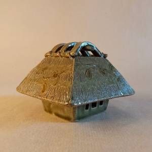 Realizzato in gres crema smaltato. È formato da due pezzi, il tetto può essere sollevato per inserire all'interno un cono di incenso.