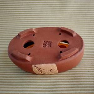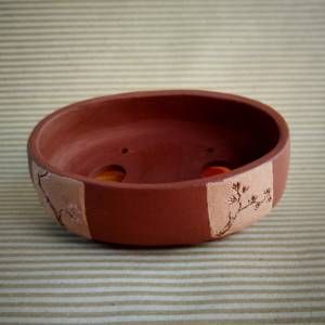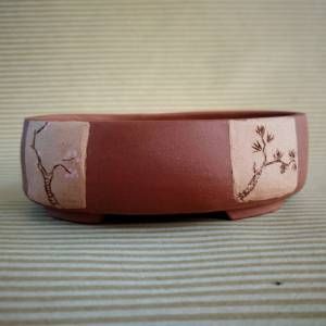 Vasetto ovale non smaltato, realizzato in gres di due colori diversi, decoro realizzato con la tecnica del graffito, i fiori dell'ume sono dipinto con engobbio rosa.