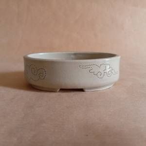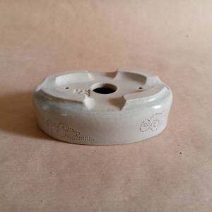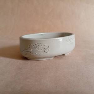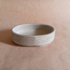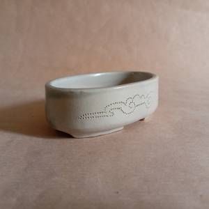 Piccolo vaso ovale in gres smaltato, con nuvole stilizzate incise sulla superficie.