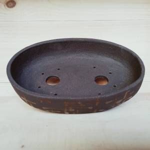 Vaso ovale in gres nero con motivi che ricordano degli ideogrammi astratti in smalto effetto bronzo.