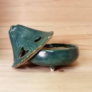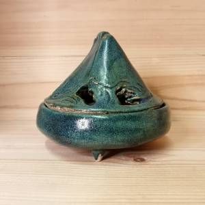 Realizzato in argilla refrattaria smaltata. È formato da due pezzi, il tetto può essere sollevato per inserire all'interno un cono di incenso.