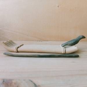 Zattera con remo e cormorano, in gres non smaltato.