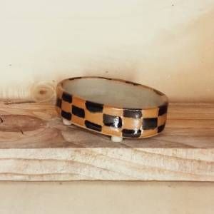 Piccolo vaso per mame bonsai, realizzato in gres crema e smaltato con un motivo a scacchi utilizzando due smalti di colore diverso di mia produzione