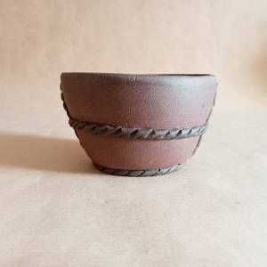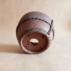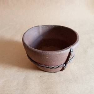 Vasetto per kusamono in gres non smaltato con una corda in contrasto che si annoda davanti e dietro. Anche il piedino è una corda dello stesso colore di quella che avvolge il vaso.